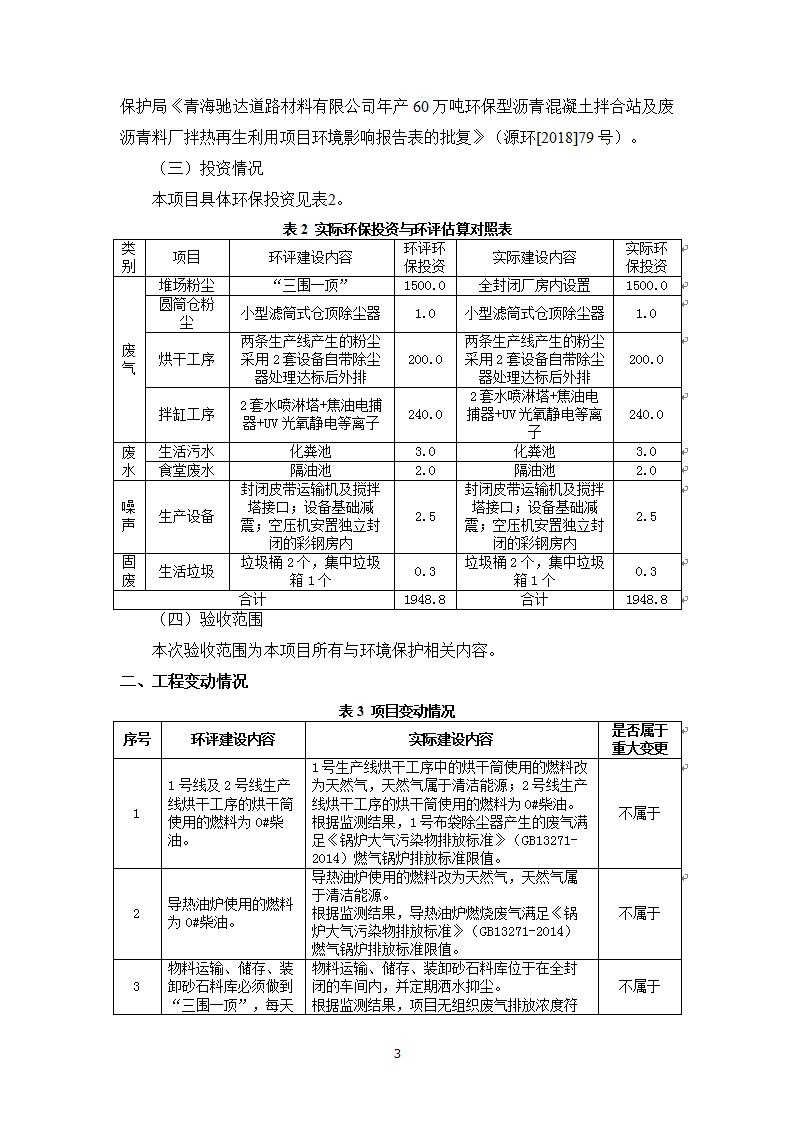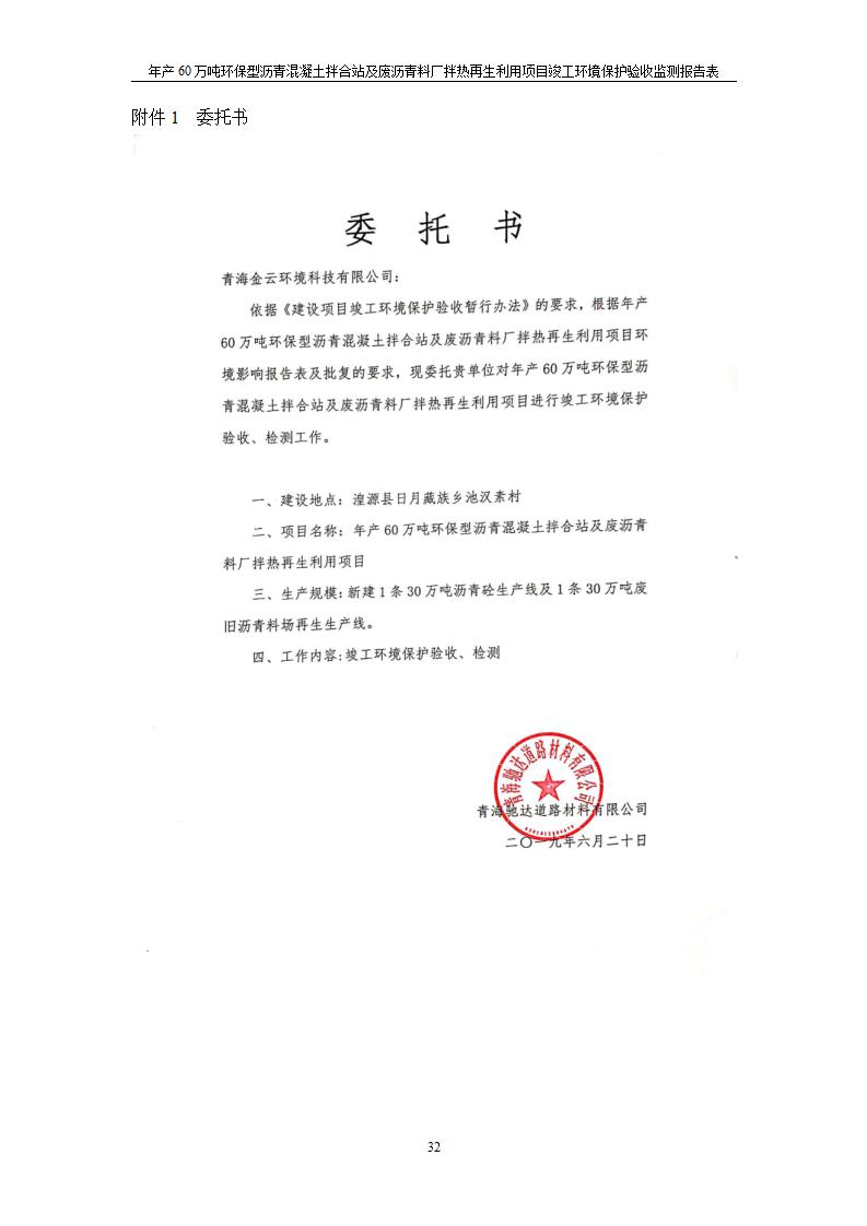 根據(jù)中華人民共和國國務(wù)院令第682號《國務(wù)院關(guān)于修改〈建設(shè)項目環(huán)境保護管理條例〉的決定》和《建設(shè)項目竣工環(huán)境保護驗收暫行辦法》(國務(wù)院令682號),青海馳達道路材料有限公司年產(chǎn)60萬噸環(huán)保型瀝青混凝土拌合站及廢瀝青料廠拌熱再生利用項目竣工環(huán)境保護驗收監(jiān)測報告表公示如下。 一、項目名稱:年產(chǎn)60萬噸環(huán)保型瀝青混凝土拌合站及廢瀝青料廠拌熱再生利用項目竣工環(huán)境保護驗收監(jiān)測報告表 二、地點:湟源縣日月藏族鄉(xiāng)池漢素村 三、建設(shè)單位:青海馳達道路材料有限公司 四、建設(shè)內(nèi)容:本項目共有2條瀝青砼生產(chǎn)線及1條穩(wěn)定土生產(chǎn)線,配套辦公樓等。 五、聯(lián)系人:楊工 六、聯(lián)系電 話:0971-6515411 七、公示時間:二〇二〇年七月六日至二〇二〇年七月三十一日 公示期間,對上述公示內(nèi)容如有異議,請以書面形式反饋,個人須署真實姓名,單位須加蓋公章。