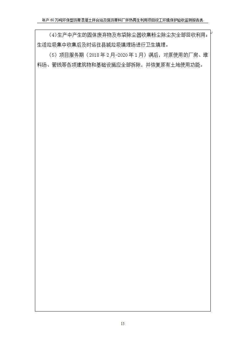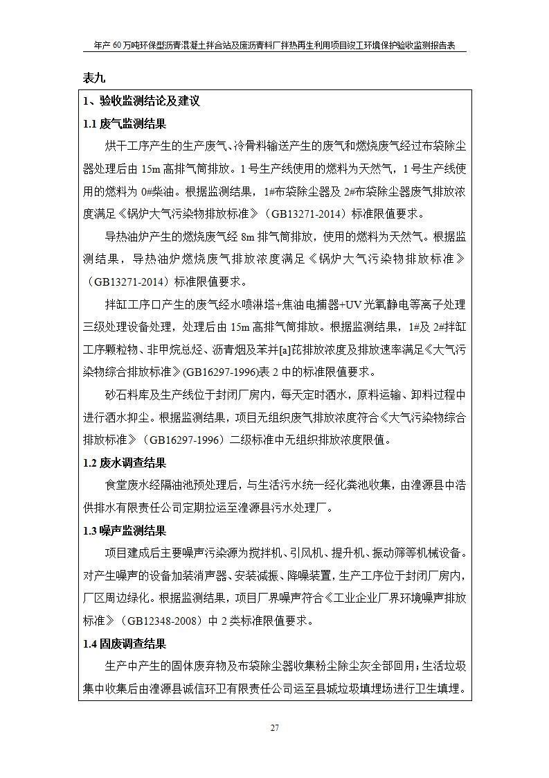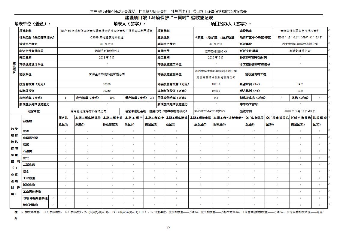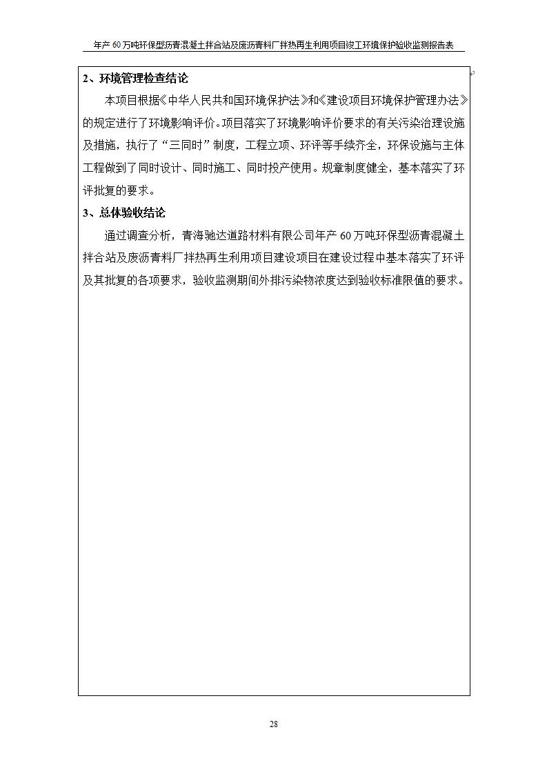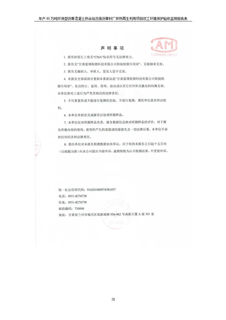 年產(chǎn)60萬噸環(huán)保型瀝青混凝土拌合站及廢瀝青料廠拌熱再生利用項目竣工環(huán)境保護驗收監(jiān)測報告表公示發(fā)布日期:(2020-7-6) 點擊次數(shù):3856 |